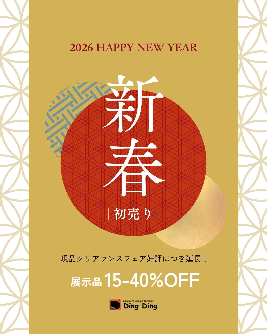 DingDingオンラインショップでは おうちに居ながらお好きな家具をご購入頂けます! 今なら配送料無料! ショップ入り口はコチラ 新春初売り「クリアランスフェア」期間延長しています! カリモク60をはじめとする店内展示商品が15-40%OFFに! 普段のクリアランスフェアより値引き率高めです。 詳しくはコチラ 「キリムフェア」開催中! 店内キリム・ギャッベラグ、クッションが全品10%OFF! 大判オールドキリムからお手頃なニューキリム、 お部屋のピンポイントになるクッション、足マットサイズ等多数入荷しています。 詳しくはコチラ 久和屋がオンラインで購入できるようになりました! 無垢材で木の温もりが感じられる久和屋のTVボードや スツールなどがネットからもお求めいただけます。 詳しくはコチラ カリモク60 生地・木部サンプル無料プレゼント中実物を確かめたいけど店舗にお越しいただけないお客様のために、 カリモク60 生地・木部サンプルを無料でお届けいたします! 詳しくはコチラ LINE友だち追加はコチラから! 友だち限定のクーポンや商品情報、 お得なフェアのお知らせをLINEでお届けします。 新規登録で1,000円OFFクーポン配信中 DingDingインテリアショップ 埼玉県さいたま市北区東大成町2-74-1 1F TEL/FAX 048-652-0962 E-mail info.dingding@gmail.com 年末年始の営業は、 店舗・オンラインショップともに 12月29日(月)~ 1月3日(土) まで休業とさせていただきます。 インターネット等からの注文・お問合わせに 関しましては、1月4日(日)から 順次対応させて頂きます。 休業期間中につきましては何かとご迷惑をおかけいたしますが、