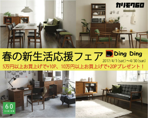 卒業、入学、転職、お引越し… この春からの新生活に向けて、 新しいインテリアや暮らしのアイテムを揃えてみませんか? ダイニングセット、ソファ、デスク、照明etc 流行に左右されない60年代からのロングライフデザインは、 今年からの新生活アイテムにピッタリ! 長年愛用し続けていただきたいという拘りが詰まっています♪ 2017年4月1日(土)~4月30日(日) の期間中、 Ding Ding「春の新生活応援フェア」を開催しております! ポイント増量キャンペーン! 購入時に発行させていただいているポイントカードに、 普段よりも多くポイントを付けさせていただきます♪ ・50,000円以上のご購入で…ポイント+10P(30,000円お買上げ相当) ・100,000円以上ご購入で…ポイント+20P(60,000円お買上げ相当) を、通常ポイントに加算させて頂きます! 貯まったポイントで、ワンアイテムお買い足しも可能です♪