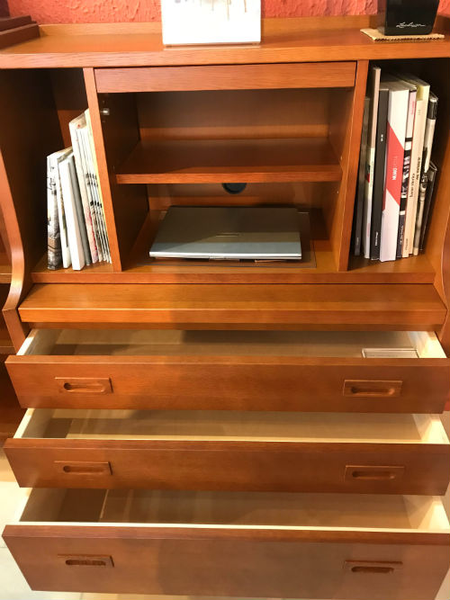皆様いかがお過ごしでしょうか? 空調の不調によりもやもやと暑かった当店ですが、 先日のブログでお伝えした工事により空調は絶好調となりました! 涼しい店内でゆっくりと家具を見ていただけますので 是非ご来店くださいませ♪ 本日は省スペースで多機能な、 カリモク60 ライティングチェストをご紹介致します! ・ライティングチェスト ¥100,000 + 税 このように3段引き出しがあるので収納たっぷりで なんでも入れることができます! 引き出しの上を引っ張ると・・・ このように中天板が出てきてデスクスペースが出現します。 先日カフェテーブル1200のサイズ比較に使ったノートPCを置いてみました。 広さの感覚など伝わりますでしょうか? 耐荷重は30kg, 物書きなどにも使っていただけそうですね。 実はここに配線用の孔が開けられているので コードなどを通す事が出来ます◎ 棚板の高さも簡単に変えられます。 さらにさらに、 上部を引き出すと・・・ 鏡が出てきました! この鏡は角度を3段階で簡単に調節出来るのでとても使いやすいです。 鏡後ろの棚上部は鏡に隠れて見えない、かつ、取り出しやすいので 忙しい毎日にもばっちりです! 横の魅せる収納、3段引き出しのしっかり収納と使い分けできます◎ カリモク60公式のルームイメージはこんな感じ。 アームレスダイニングチェアとはサイズ感もぴったりですし、 お色も木部の色が揃っているので統一感がありますね。 店頭ではアーロンチェアとあわせて展示しております。 もちろんおかけになれますので 是非お試しにご来店くださいませ♪ 皆様のご来店、心よりお待ちしております。 DingDingインテリアショップ 埼玉県さいたま市北区東大成町2-74-1 1F TEL/FAX 048-652-0962 E-mail info.dingding@gmail.com http://www.dingding.jp/ PR ● コメントフォーム |