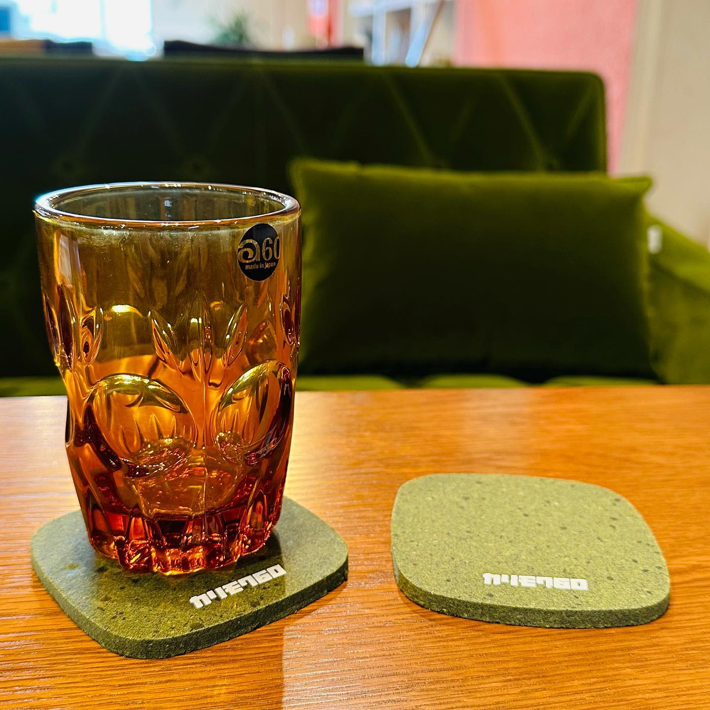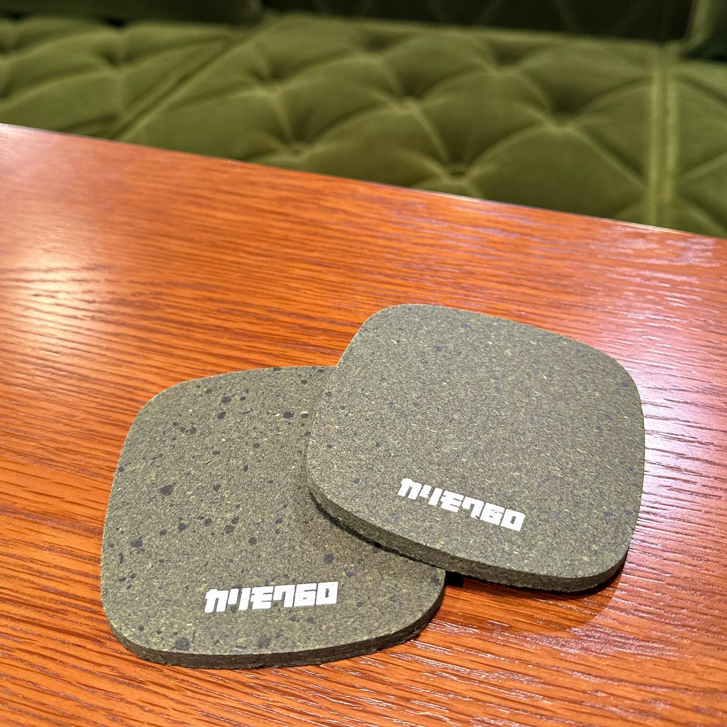 モケットグリーンの張地端材をアップサイクルしたコースター