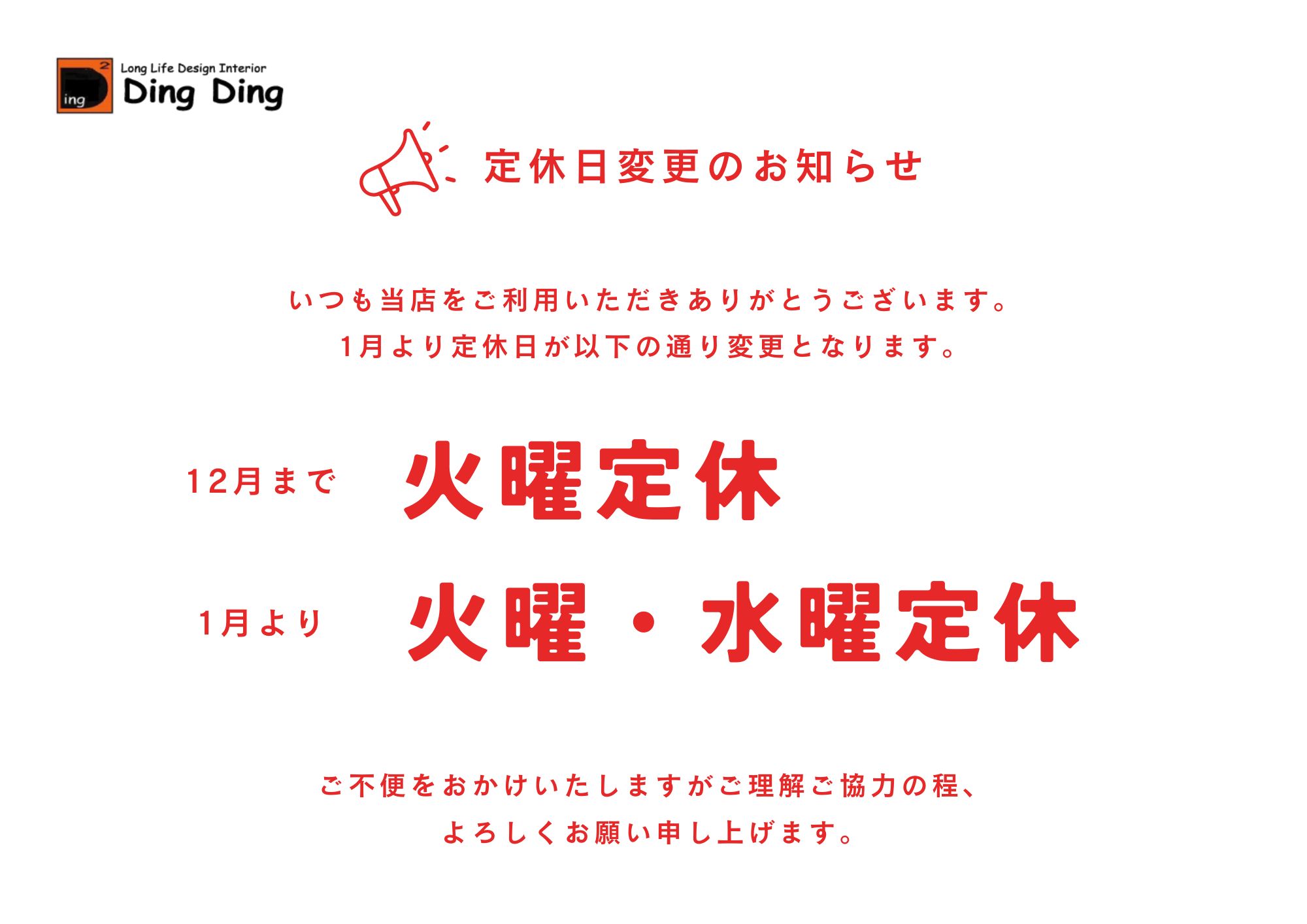 いつもDing Dingをご利用いただきありがとうございます。 1月より定休日が以下の通り変更となります。 12月まで 火曜定休 ↓ 1月より 火曜・水曜定休 ご不便をおかけいたしますが、 ご理解ご協力の程よろしくお願い申し上げます。 年内の営業は12月29日(木)まで、 年始は1月4日(水)からとなります。 皆様のご来店をスタッフ一同、心よりお待ちしております♪ ∴‥∵‥∴‥∵‥∴‥∴‥∵‥∴‥∵‥∴‥∴‥∵ DingDingオンラインショップでは おうちに居ながらお好きな家具をご購入頂けます! 今なら配送料無料! ショップ入り口はコチラ DingDing「クリスマスフェア」11/23(水・祝)よりスタート! 詳しくはコチラ K60 限定生産ご当地Kチェア第1弾「神戸タータン」販売中! 詳しくはコチラ K60 限定生産ご当地Kチェア第2弾「美作ヒノキ×倉敷帆布」販売中! 詳しくはコチラ LINE友だち追加はこちらから! 友だち限定のクーポンや商品情報、 お得なフェアのお知らせをLINEでお届けします。 新規登録で1,000円OFFクーポン配信中! 《重要》当店のコロナウイルス感染予防策についてはコチラ DingDingインテリアショップ 埼玉県さいたま市北区東大成町2-74-1 1F TEL/FAX 048-652-0962 E-mail info.dingding@gmail.com PR ● コメントフォーム |