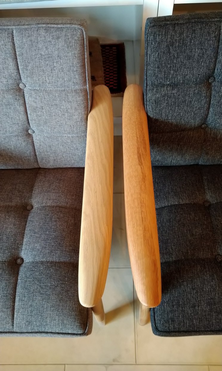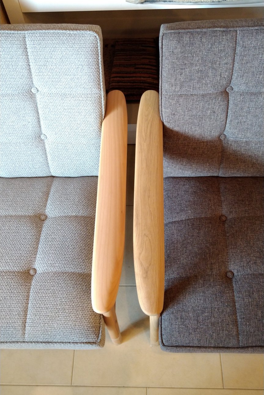 カリモク60では、木肌の色を活かした明るい色目のナチュラル系のバリエーションが増えて 多様なお部屋のイメージに合わせやすくなりました。 人気の北欧系にもぴったりのアイテムが揃っています。 現在ナチュラル系は、 従来からのピュアビーチ(上の画像)、ブラックチェリー、サントリー樽ものがたりのホワイトオークに加え、最近発売となったピュアオークがあります。 コロナ禍で店頭でご覧いただくのが難しい方もいらっしゃると思いますので、 画像でKチェアを例に、比較してみることにしましょう! ※ブラックチェリーは違いが明確なので、まずは他の3種のみ比較します。 張地は人気のグレーが3種並びましたので、この際一緒にご覧下さい。 左から、 木部/ピュアビーチx張地/ミスティーグレー 木部/ピュアオークx張地/べスパグレー 木部/樽ものがたりのホワイトオークx張地/限定色 左から2つづつ比較してみます。 左ピュアビーチは右ピュアオークよりややピンク味を帯びた色目です。 木目も違いがあり、 ビーチ(ブナ)⇒白っぽい北欧風の色味と、きめの細かい柔らかな質感。 オーク(ナラ)⇒ 虎斑という模様が見られ、重厚で硬い。 次に右側の2つ。 どちらもオークですが、右は「サントリーの樽ものがたり」。 ウイスキー醸造の役目を終えた樽(ホワイトオーク)を加工して作られている為、 ウイスキーのシミや釘あとが残っています! 「サントリーの樽ものがたり」は物語性があるシリーズなのです。 右の黒っぽいグレーは「サントリーの樽ものがたり」限定色です。 他の2種の張地はパターンオーダーでも使われており、 Kチェアだけでなく、他のソファやチェアなどに組合せることができます。 赤みを帯びたブラックチェリーはこちら。張地は限定のフラノベージュ。 ブラックチェリーは使っているうちにだんだん色が濃くなり、アームは触っているうちにいい色艶がついてきます。 経年変化を楽しんでいただけるシリーズとなります。 店頭では、ナチュラル系各シリーズを近いエリアにレイアウトしていますので、 実際に見て触れて木肌のやさしさを実感してみてくださいね♪ 皆様のご来店、心よりお待ちしております♪ ∴‥∵‥∴‥∵‥∴‥∴‥∵‥∴‥∵‥∴‥∴‥∵ DingDingオンラインショップでは おうちに居ながらお好きな家具を送料無料でご購入頂けます! ショップ入り口はコチラ♪ カリモク60 2020年9月新作アイテム多数追加! カラーバリエーションや新作が追加になりました。 詳しくはコチラ♪ 《重要》当店のコロナウイルス感染予防策についてはコチラ DingDingインテリアショップ 埼玉県さいたま市北区東大成町2-74-1 1F TEL/FAX 048-652-0962 E-mail info.dingding@gmail.com PR ● コメントフォーム |
