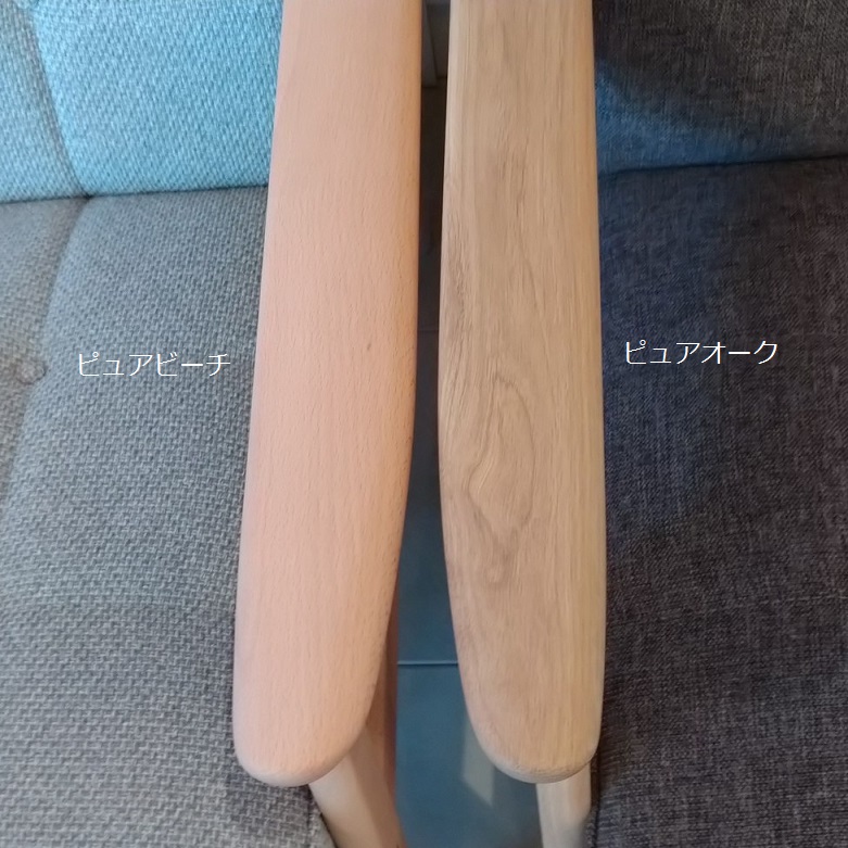 アームトップの樹種がラバートリー材からブナ材に変更になりました! 左:旧 ラバートリー材 右:新 ブナ材 遠巻きから見るとほぼわかりませんが、 樹種の変更により木目の出方に少し違いが出ています。 Kチェアのアームは1本の材料を削り出して加工をしていますが、 これらの問題を解消するため、