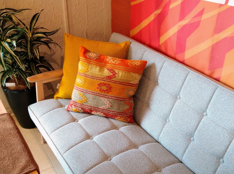 クッションは、お部屋のアクセサリー的な存在であるばかりでなく、 背もたれやアームに使うことで格段にすわり心地がよくなります。 Kチェアはアームが木製なので、 ちょっとアーム側に寄りかかるときにクッションがあれば快適♪ 枕代わりにクッションを使ってゴロンもできます。 手織りのキリムクッションはどれもが1点もの。
